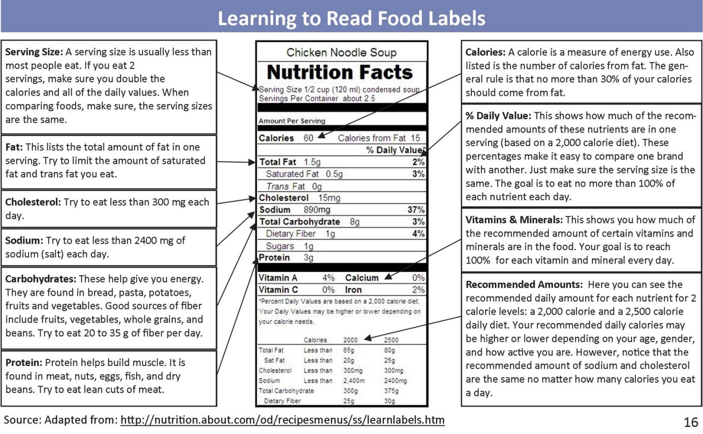 Do you know how to read a label? – Probably not It seems there’s very little understanding about labels. Even Googling “food labels” yields relatively poor generic results. Mostly labels focus on just calories but we are discovering is that even calories don’t mean much. See the following great resources: Gary Taubes’s incredible work: Good Calories Bad Calories http://www.amazon.com/Good-Calories-Bad-Gary-Taubes-ebook/dp/B000UZNSC2/ref=sr_1_1?s=books&ie=UTF8&qid=1457569367&sr=1-1&keywords=good+calories and …